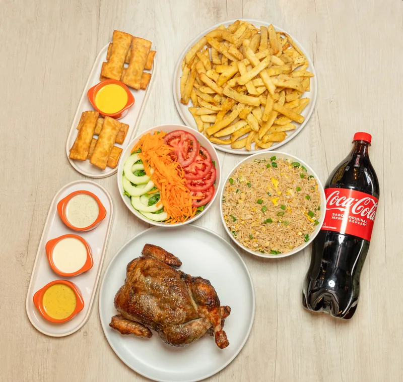 1 Pollo a la leña + papas fritas familiar + chaufa familiar + 8 tequeños brasa + ensalada + gaseosa de 1.5 lt (Coca cola o Inka Cola) + salsas (6 ajís de la casa + 6 mayonesa artesanal + 2 viangretas).